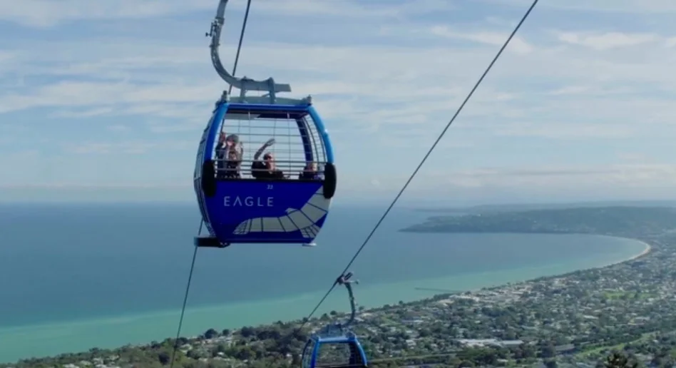 Arthurs Seat Eagle is an aerial gondola system, which is supported and propelled by cables from above. It consists of a loop of steel cable that is strung between two stations, over 11 supporting towers. The cable is driven by a bullwheel (a large pulley) at the base and summit stations, connected to an electric motor.